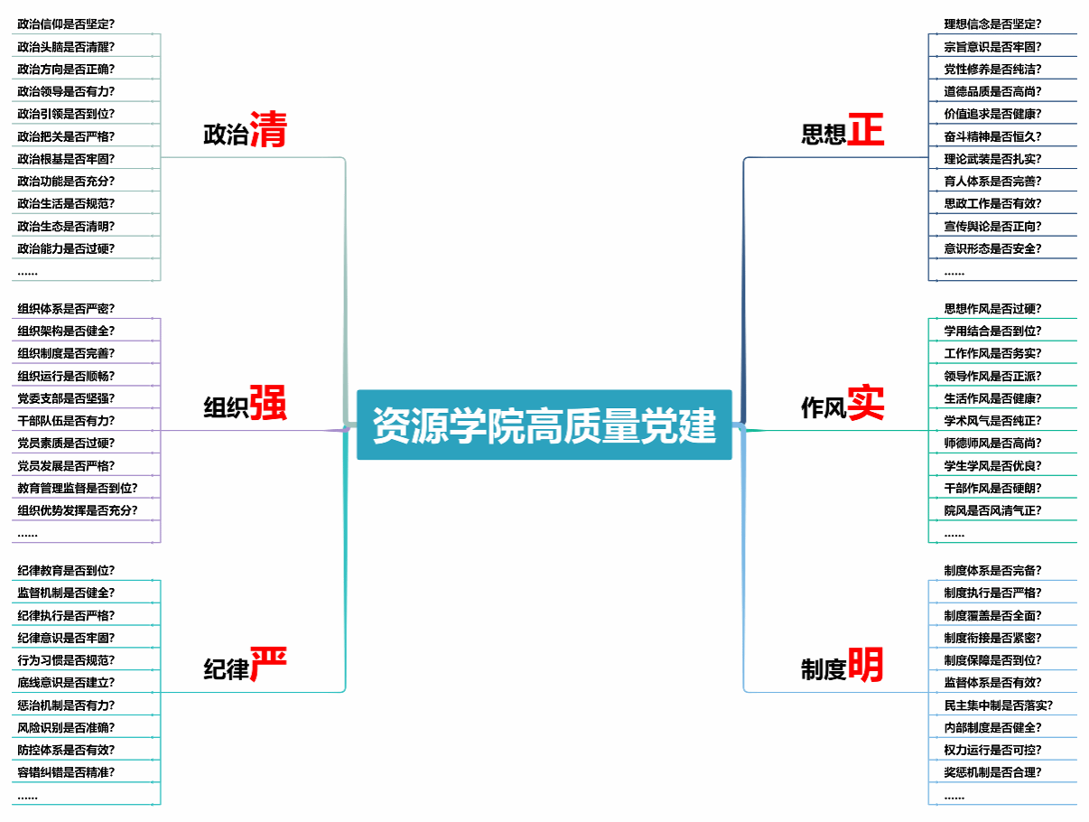 坚持科学、系统、规范原则,细化“4+12”党建工作体系,聚焦“什么是资源麻豆在线 高质量党建”关键问题,从党的六大建设入手,以“政治清、思想正、组织强、作风实、纪律严、制度明”为出发点和落脚点,探索构建了资源麻豆在线 高质量党建框架体系,开出党建“问题单”,明确“任务书”,制定“施工图”,为党建工作质量提升建立政策理论依据及实践探索基础。与此同时,通过推行麻豆在线 领导班子“三张清单”、制定麻豆在线 年度党建工作重点任务清单、构建党建制度体系等举措,逐级夯实责任,逐项抓好落实,持续提升党建工作科学化、系统化、规范化、实效化水平。